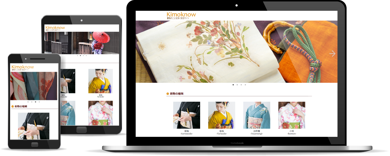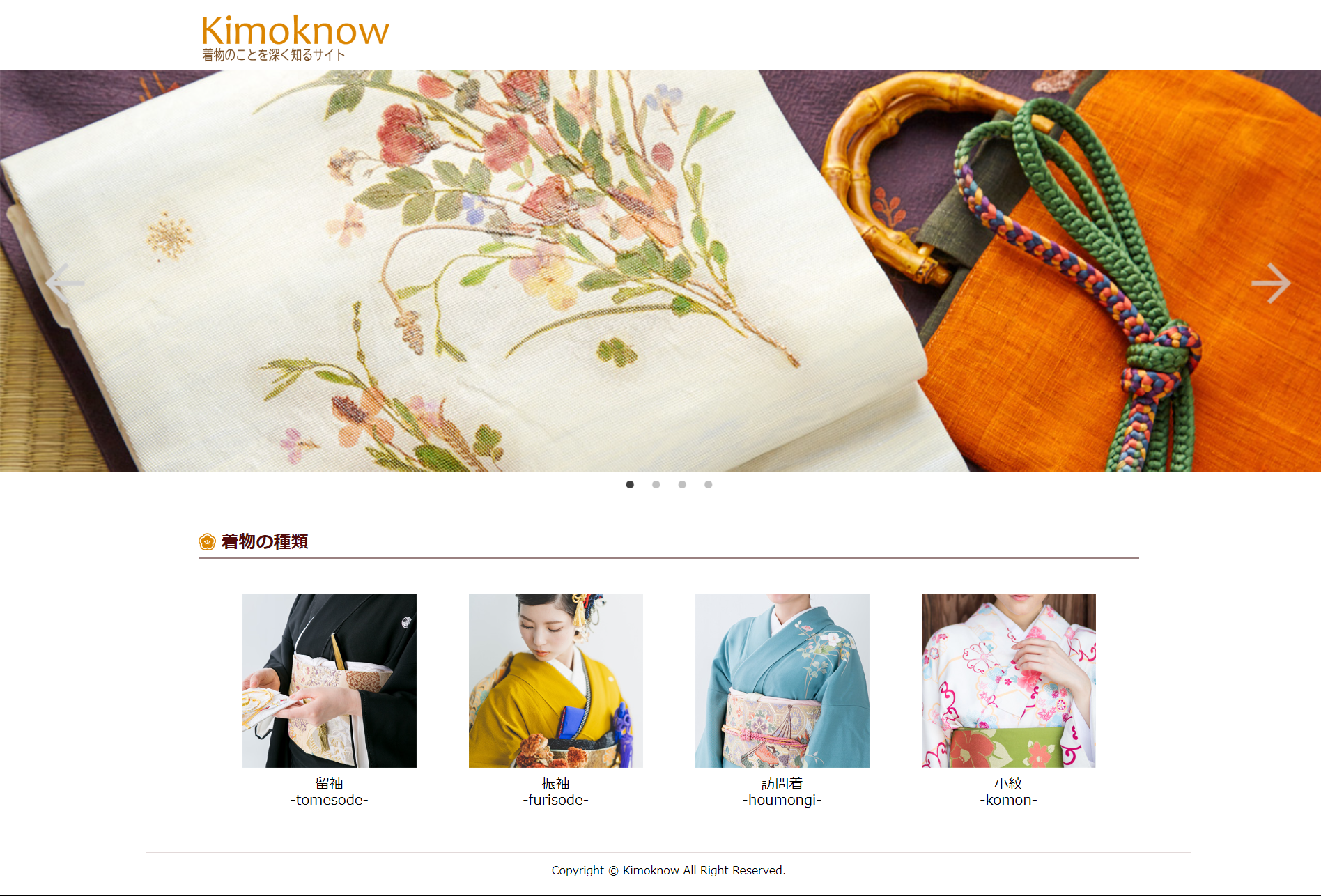 着物の種類を紹介する情報サイトです。jQueryを用い、トップ画像のスライドやクリックすると別画面がポップアップ表示されるモーダルウィンドウなどを実装しました。