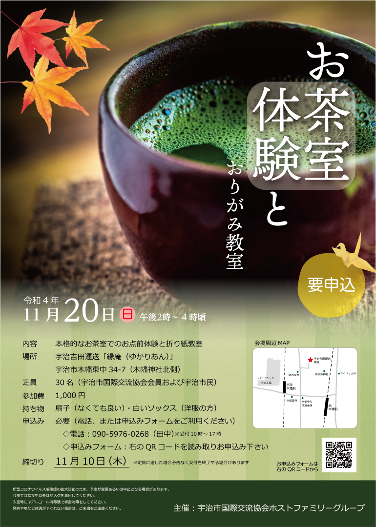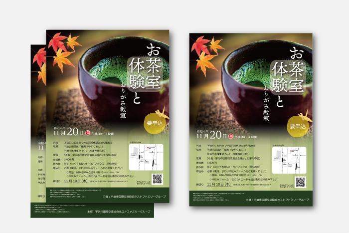 お茶室体験イベントチラシ 概要 宇治市国際交流協会ホストファミリーグループ様 URL: 仕様/担当 デザイン 地元宇治でのお茶室体験イベントのチラシです。11月の開催とあり、秋らしい色使いとデザインを意識しました。生涯学習センターや福祉会館などで配架頂き、大変喜んでいただきました。