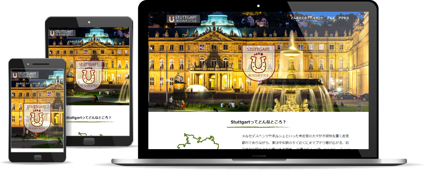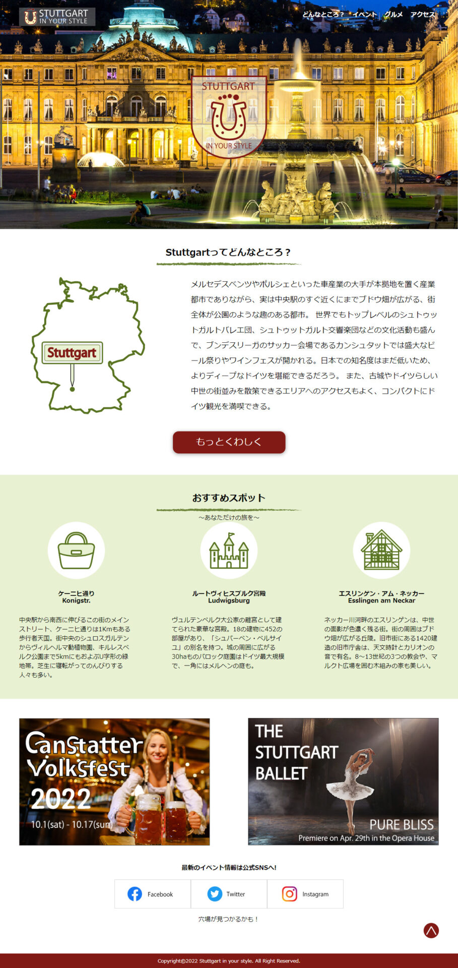 私が昔滞在していたドイツ、シュトゥットガルトをテーマに、観光情報サイトを作成しました。 主にイラストレーターを使用し、ロゴやアイコン、下部のバナーも全て一から制作しています。